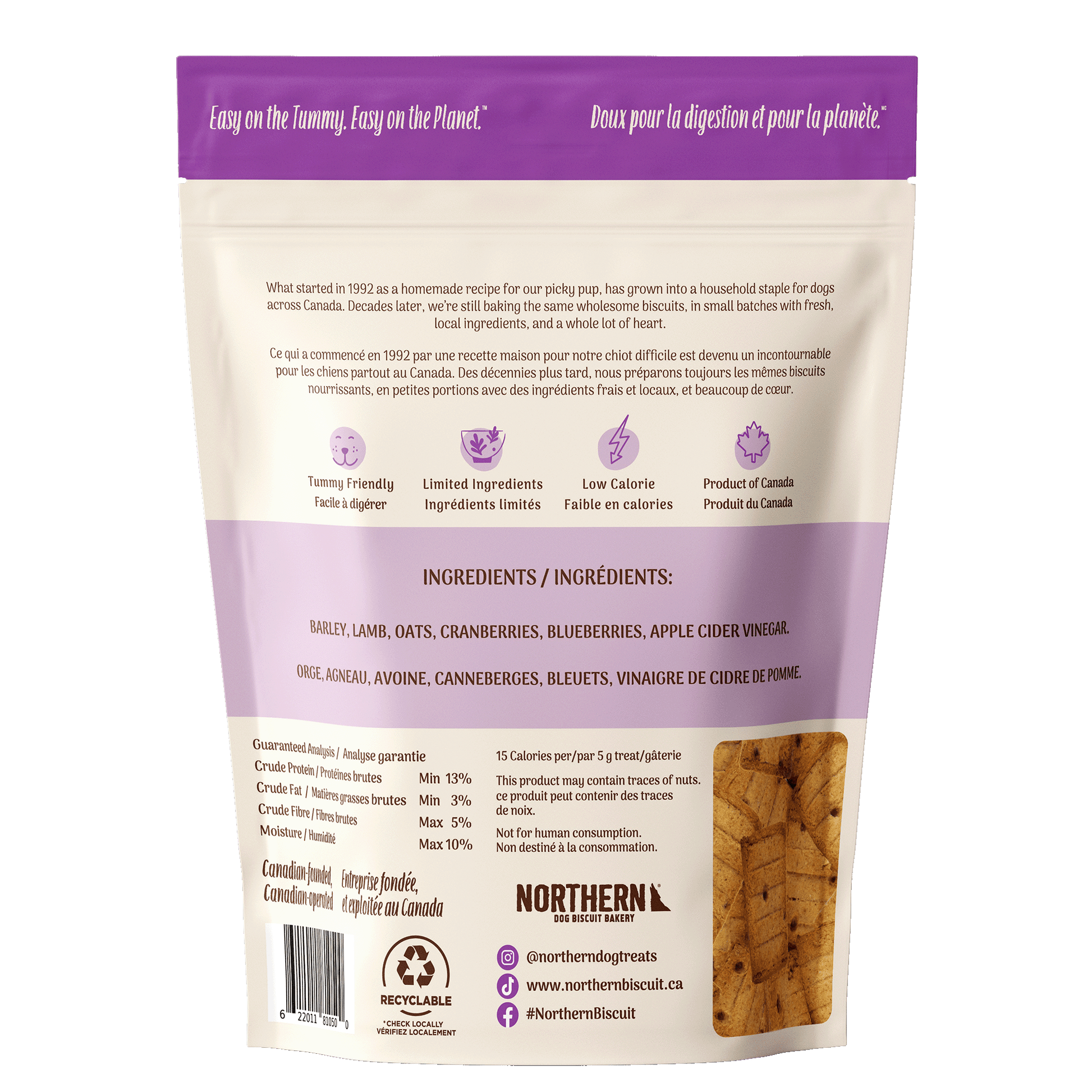 Made with free-roaming New Zealand lamb, this best-selling recipe is a healthy, easily digestible alternative to beef. Gentle on sensitive stomachs, lamb makes these treats easy to enjoy for even the most sensitive pups. Baked in small batches with our signature Northern CRUNCH™ and naturally preserved, these biscuits are just 15 calories per 5 g treat and perfect for pet parents who love simple, wholesome ingredients.