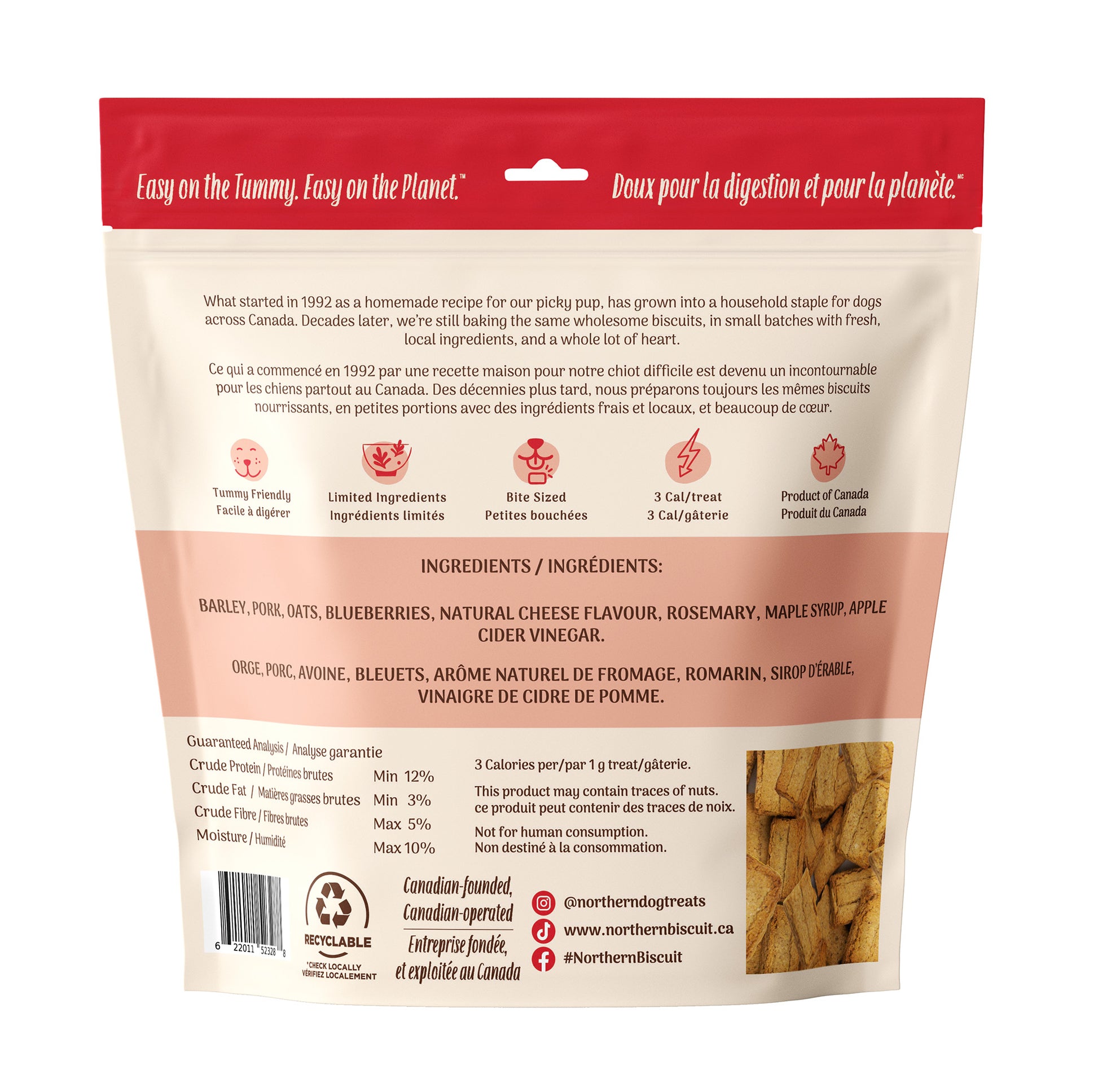 A true Canadian classic! Savoury pork, sweet blueberries, and a drizzle of pure maple syrup combine for a treat dogs can’t get enough of. Baked into crunchy 1 g biscuits with only 3 calories each, they’re perfect for training or on-the-go snacking, with a simple ingredient list you can feel good about.