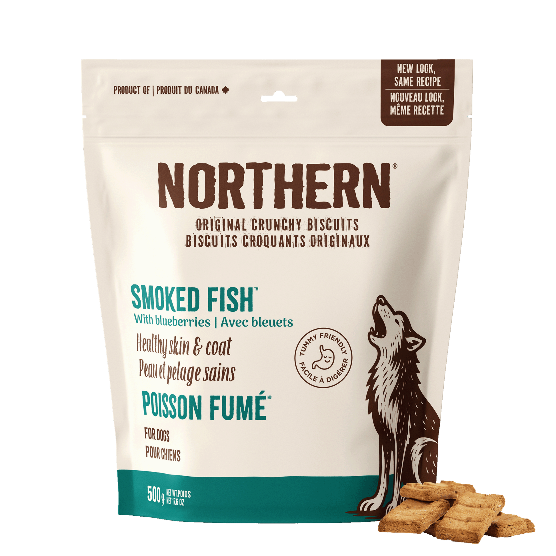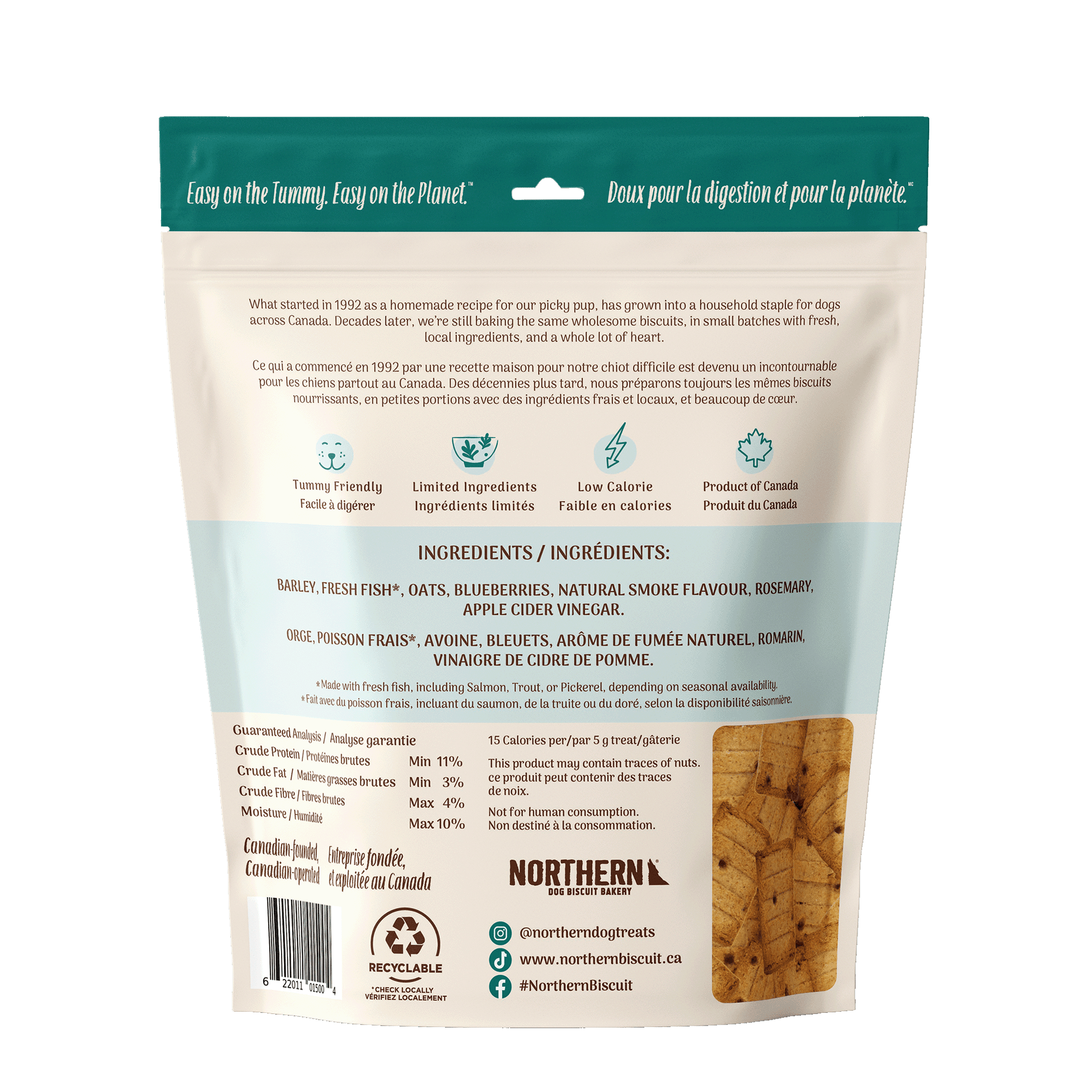 Made with fresh fish — Salmon, Trout, or Pickerel, depending on seasonal availability — this savoury recipe is a healthy, easily digestible alternative to traditional proteins and naturally high in omega-3s. With our signature Northern CRUNCH™ and naturally preserved, these biscuits are just 15 calories per 5 g treat and perfect for pet parents who love simple, wholesome ingredients.